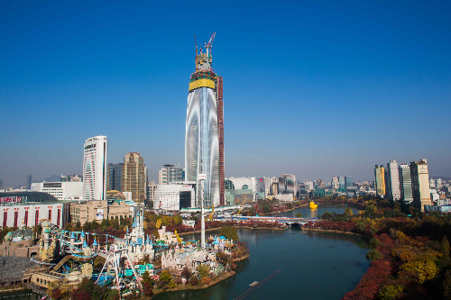 You've probably seen it without realizing: a mirror-still lake ringed with cherry blossom trees in full bloom, their pale pink petals reflected perfectly in the water — and rising above it all, the glass tower of Lotte World, 123 floors of steel and light soaring into a blue April sky.